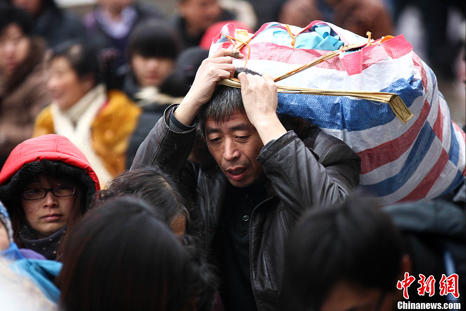 2月5日,青岛火车站广场上,风雪中的旅客有的拖着行李箱,有的扛着行李袋,或是提着大礼包,一个个急匆匆地赶往候车室门前,排队等候验票进站。这回家的行李,是旅客的负担,更是家人的期盼。当日,青岛火车站迎来春运后的第二个高峰,预计发送乘客约3万多人。中新社发 徐崇德 摄