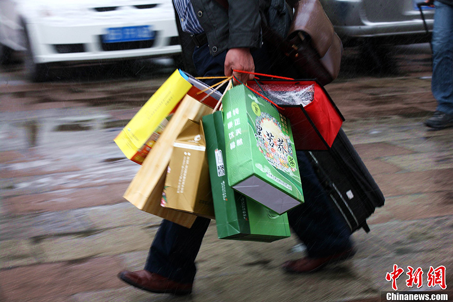 2月5日,青岛火车站广场上,风雪中的旅客有的拖着行李箱,有的扛着行李袋,或是提着大礼包,一个个急匆匆地赶往候车室门前,排队等候验票进站。这回家的行李,是旅客的负担,更是家人的期盼。当日,青岛火车站迎来春运后的第二个高峰,预计发送乘客约3万多人。中新社发 徐崇德 摄