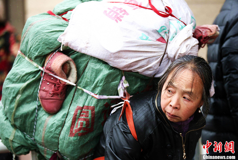 2月5日,青岛火车站广场上,风雪中的旅客有的拖着行李箱,有的扛着行李袋,或是提着大礼包,一个个急匆匆地赶往候车室门前,排队等候验票进站。这回家的行李,是旅客的负担,更是家人的期盼。当日,青岛火车站迎来春运后的第二个高峰,预计发送乘客约3万多人。中新社发 徐崇德 摄