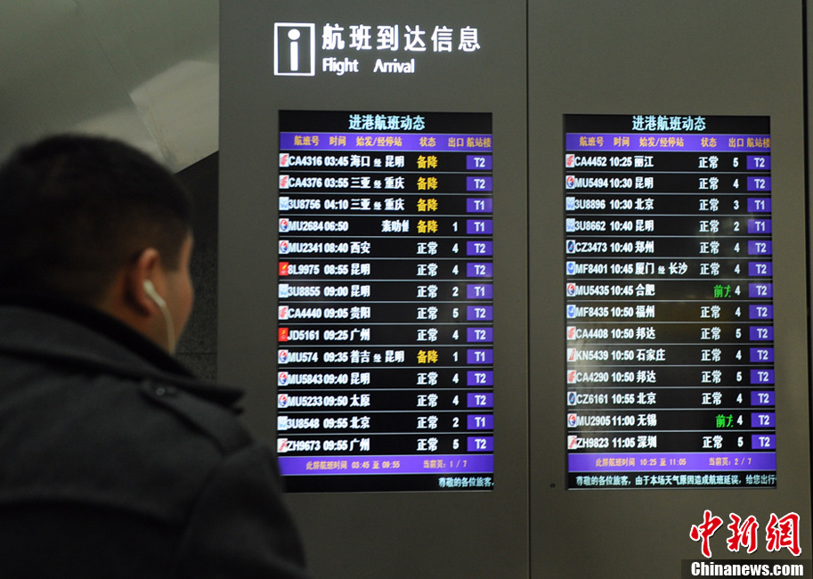 2月6日,四川成都、绵阳、眉山、乐山、资阳等地再次出现大雾天气,导致京昆高速成雅段、成绵段,成都绕城、成渝等11条高速公路先后关闭,双流机场部分航班延误。目前,受大雾影响关闭的高速公路和延误航班正在逐步恢复,节前民众返家团圆路艰辛。图为大雾导致机场航班延误。中新社发 刘忠俊 摄