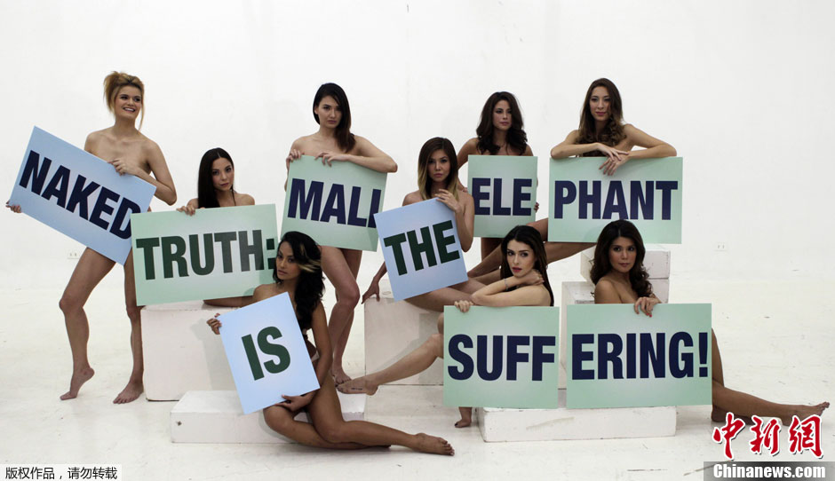 当地时间2月5日,菲律宾马尼拉,美女模特裸体出镜,高举标牌,为善待动物组织新广告拍照。当地一头名为Mali的大象逐渐变差的身体状况促使菲律宾国会同意将其转移至泰国的一个大象庇护所,许多组织支持国会的这一决定,但尚有一些人士认为此举会令大象的状况变得更加恶劣。