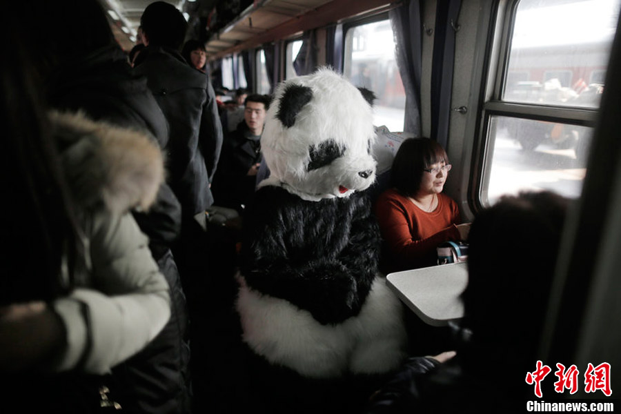 图为1月26日,春运第一天。一位女士身穿熊猫玩偶服,坐在火车上。她们一行四人,打算从北京始发前往河北沧州,然后返回,有专人记录全过程,以此方式感受春运的特别气氛。西西 摄 图片来源:CFP视觉中国