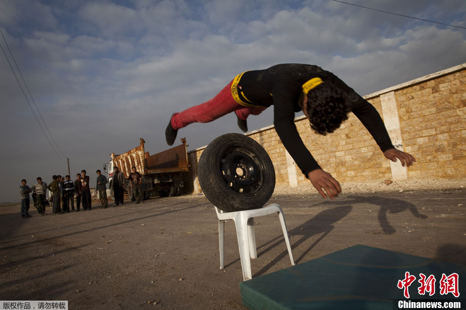 当地时间1月23日,叙利亚北部阿勒颇省Tlaleen,反政府武装将一所废弃的学校改造成一个“军事学院”,训练当地青少年各项军事技能,让他们投入到反政府武装的队伍中。