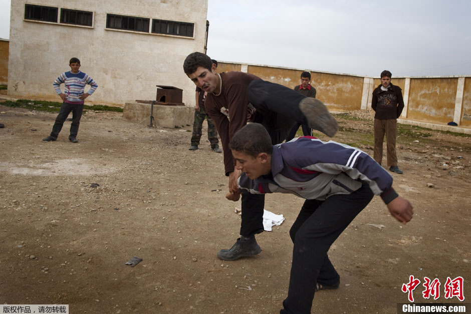 当地时间1月23日,叙利亚北部阿勒颇省Tlaleen,反政府武装将一所废弃的学校改造成一个“军事学院”,训练当地青少年各项军事技能,让他们投入到反政府武装的队伍中。