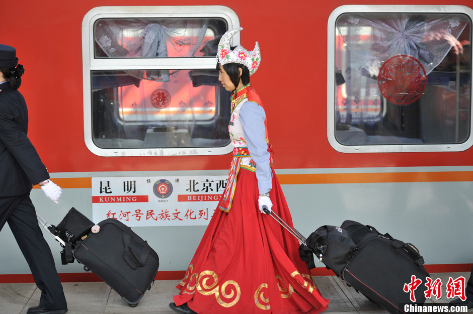图为1月26日,身着少数民族服装的“红河号”列车乘务员进站。中新社发 刘冉阳 摄