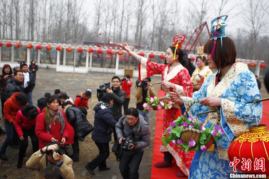 2月6日,郑州,在“春满中原”商都民俗庙会启动仪式上,“春姑娘”撒下“百事吉”糖果。当日,2013“春满中原”商都民俗庙会在郑州金鹭鸵鸟园正式启动。中新社发 王中举 摄