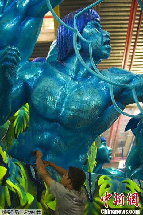 当地时间2月6日,巴西里约热内卢桑巴舞学校里,为狂欢节准备的绚丽花车已经制作完成。