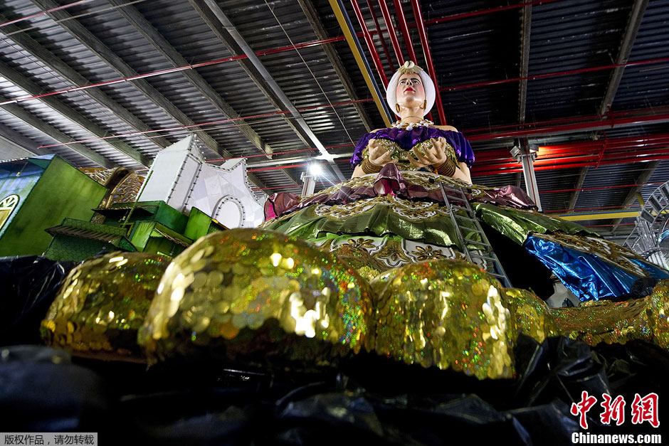 当地时间2月6日,巴西里约热内卢桑巴舞学校里,为狂欢节准备的绚丽花车已经制作完成。