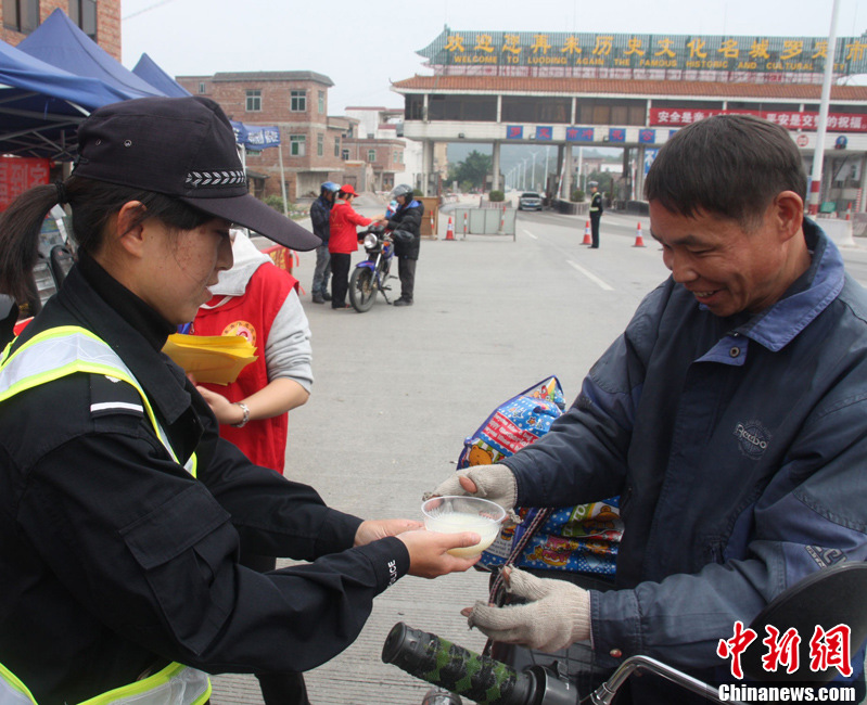 2月7日,从广东佛山、东莞、中山、珠海、广州等等地经国道324线云浮、罗定春运服务站返乡过年的“铁流客”达到了高峰。据悉,从1998年起今,罗定交警坚持15年为往返“铁骑大军”免费提供各种人性化服务,演绎春运“平安驿站”。图为现场志愿者为进服务站的“铁流客”送上热姜粥。中新社发 黄耀辉 摄