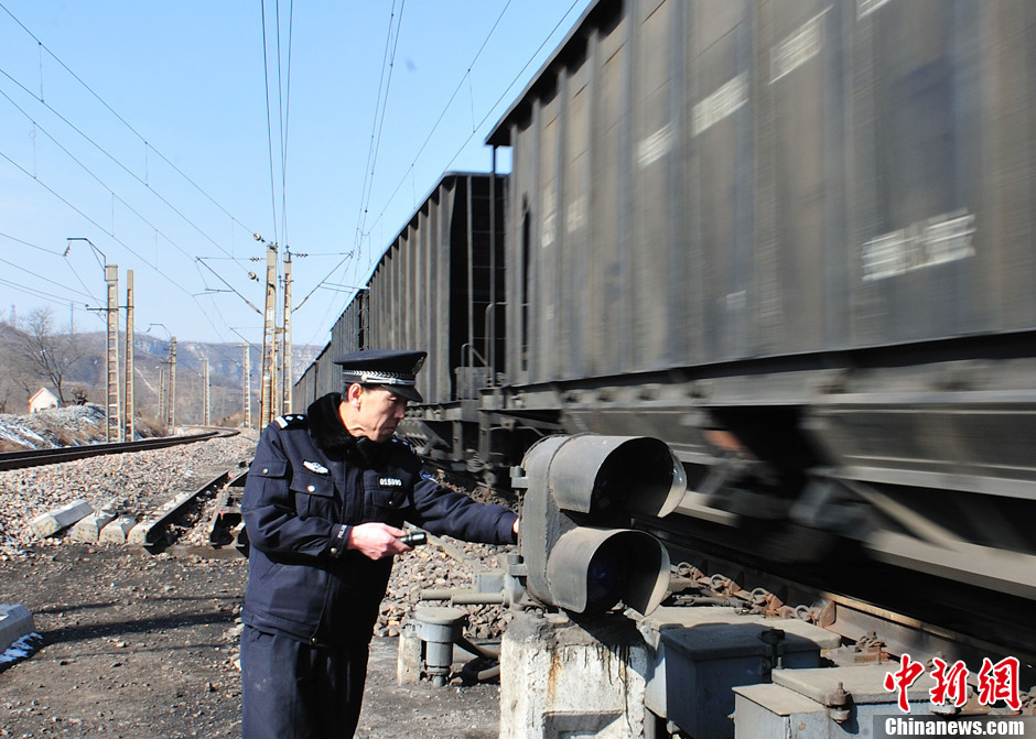 在太行山深处,石太铁路线上有一个名叫“岩会站”的四等小站,47岁的石家庄铁路公安处民警马海忠,已经独自在这里驻守了18年。岩会站是太行山腹地、石太铁路线上的一个四等小站,在警务区管辖的13公里线路上,有1个线路所、8座隧道、8座桥梁,线路巡视全凭一双脚。由于山区地形复杂,他随时处于戒备状态,18年中他步行巡线8万多公里,默默守护着铁路线的安全。图为每到一处信号灯,马海忠都要仔细检查。中新社发 翟羽佳 摄