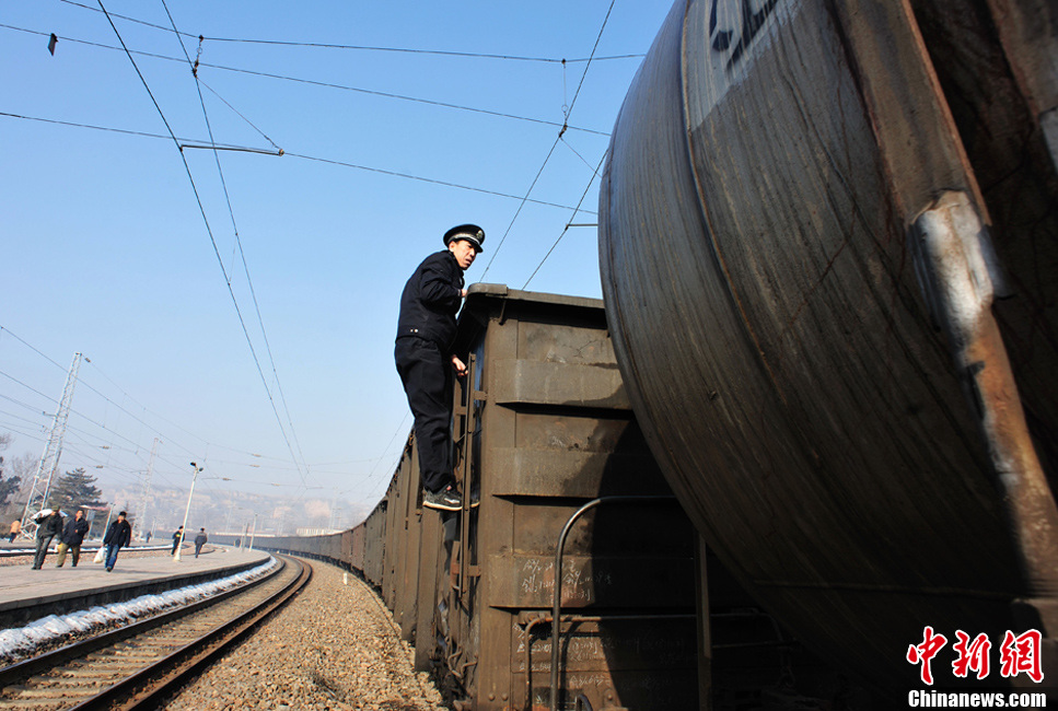 在太行山深处,石太铁路线上有一个名叫“岩会站”的四等小站,47岁的石家庄铁路公安处民警马海忠,已经独自在这里驻守了18年。岩会站是太行山腹地、石太铁路线上的一个四等小站,在警务区管辖的13公里线路上,有1个线路所、8座隧道、8座桥梁,线路巡视全凭一双脚。由于山区地形复杂,他随时处于戒备状态,18年中他步行巡线8万多公里,默默守护着铁路线的安全。图为马海忠爬上货车顶清查。中新社发 翟羽佳 摄