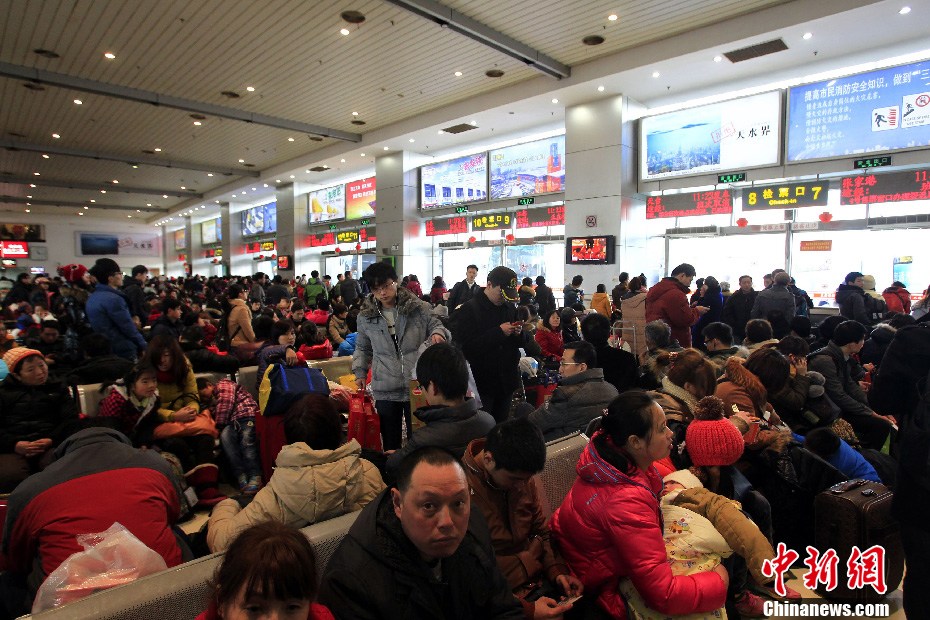 2月8日,因受雨雪冰冻影响,上海长途客运总站全线停班,长途南站部分停班,合计1300多班次。雨雪阻归程,打乱了许多回家过年人的计划。目前车站里聚集了不少等待的乘客,也有人退票选择其它交通方式。上海长途南站已经全面启动应急预案,通过客运站现场电子显示屏和广播以及电台等媒体、公司官网、微博、咨询电话等途径及时发布班次信息。中新社发 潘索菲 摄