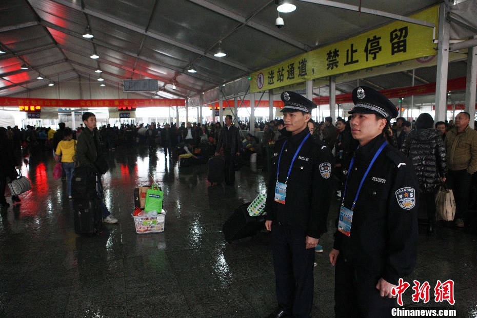 2月8日,广州火车站进站旅客明显减少,铁路民警仍然坚守一线维护车站秩序。中新社发 肖伟 摄