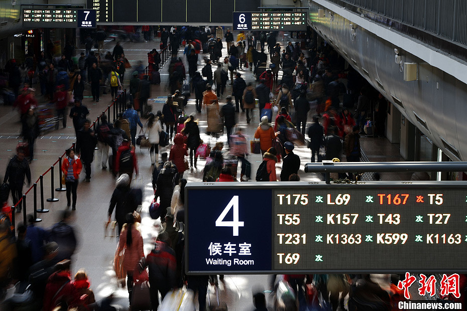 2月8日,大批旅客从北京西站乘车离京。明日将进入春节黄金周假期,铁路、公路、民航运输9日将全面迎来节前客流最高峰。中新社发 富田 摄