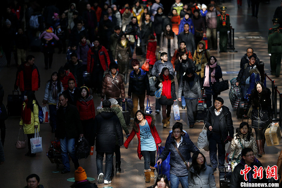 2月8日,大批旅客从北京西站乘车离京。明日将进入春节黄金周假期,铁路、公路、民航运输9日将全面迎来节前客流最高峰。中新社发 富田 摄