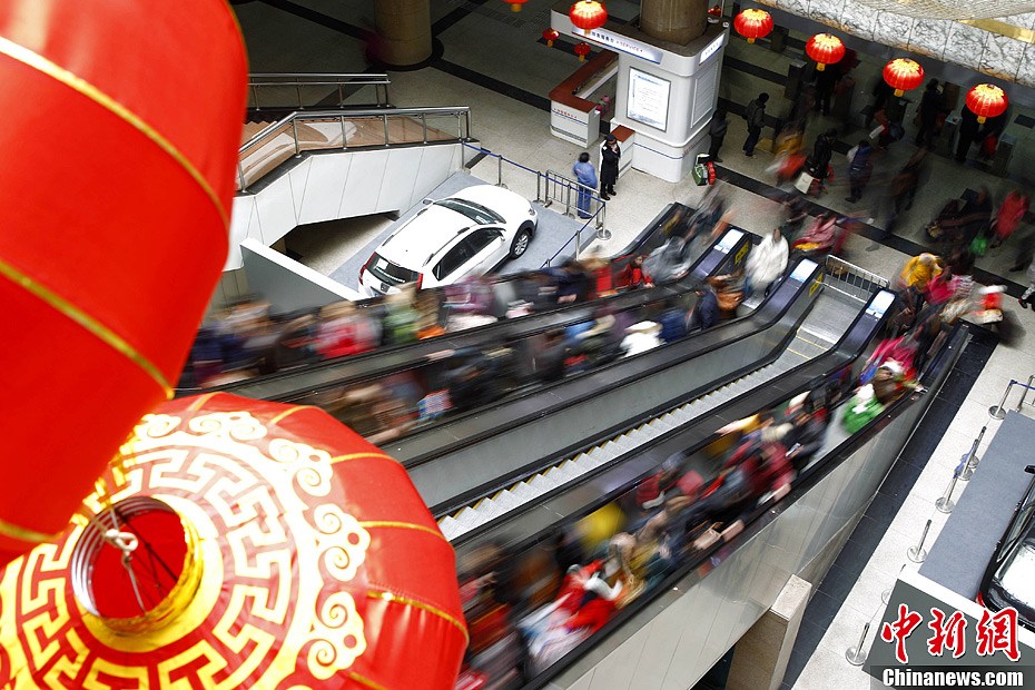 2月8日,河南郑州火车站,乘坐电梯进入候车大厅的乘客川流不息。当日,中国春运进入第14天,铁路、公路、民航运输全面迎来客流最高峰。中新社发 王中举 摄