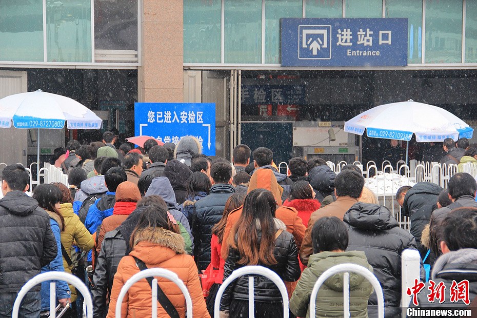 2月8日是蛇年春运的第14天,西安火车站在漫天飞雪中迎来节前最后一波春运出行高峰。中新社发 张一辰 摄