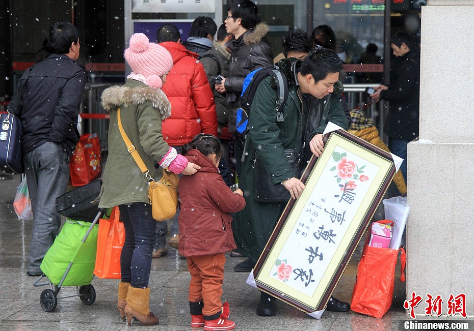 2月8日,农历除夕的前一天,汉口火车站拿着“家和万事兴”牌匾赶着回家团年的一家三口。当天,武汉迎来一场强降雪,风雪交加的寒冷的天气挡不住回家的脚步。中新社发 张畅 摄