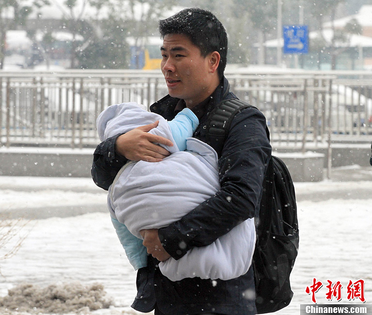 2月8日,农历除夕的前一天,汉口火车站男子怀抱着小孩进站。当天,武汉迎来一场强降雪,风雪交加的寒冷的天气挡不住回家的脚步。中新社发 张畅 摄