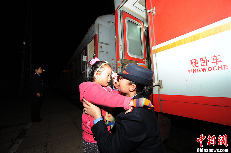 2月8日,除夕前夕,在兰新铁路线上的K9667次列车上,列车员妈妈韩爱民出发了,今年的除夕她又不能和家人一起度过了,她已经6年没和家人一起过除夕了;这趟车组全程需要四天时间,要经过她的家三次,跑完整个一趟车组才能回家。图为6岁的女儿中途看望妈妈时依依不舍。杨艳敏 摄