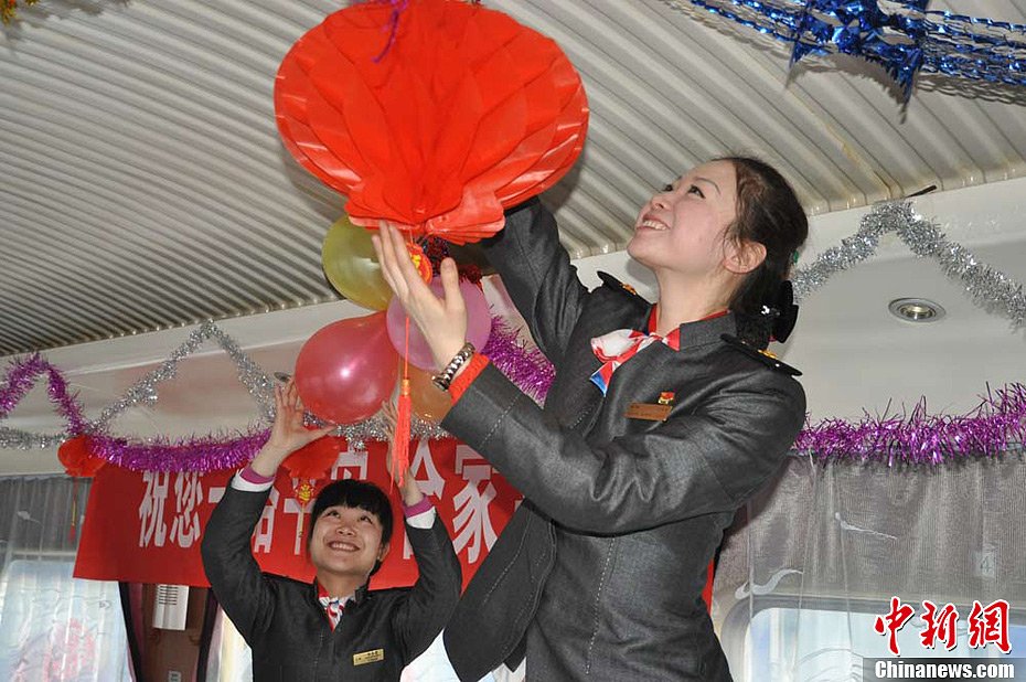 2月8日,兰州至北京西的Z56次第三包乘组的两名“90后”乘务员正在布置餐车,本次列车将于除夕夜从北京西返回兰州。她们告诉记者:“这是我们第一次离开家人在列车上过年,得把餐车打扮的漂漂亮亮的,给旅客一个惊喜,他们会喜欢吗?刘磊 摄