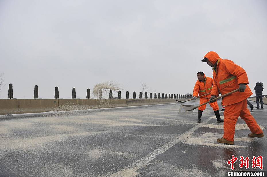 2月8日,湘中及以北地区迎来低温雨雪冰冻天气,部分路段出现道路结冰情况,给回家过年的人们造成不便。当天,京港澳高速湖南临长段发生多起车辆追尾事故,高速公路路政、养护、服务区工作人员全力投入到春运保畅工作中,确保广大民众平安出行。图为在京港澳高速湖南临长段,养护人员向结冰路面撒融雪剂。江钻 摄
