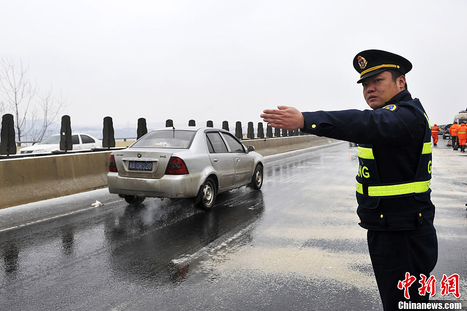 2月8日,湘中及以北地区迎来低温雨雪冰冻天气,部分路段出现道路结冰情况,给回家过年的人们造成不便。当天,京港澳高速湖南临长段发生多起车辆追尾事故,高速公路路政、养护、服务区工作人员全力投入到春运保畅工作中,确保广大民众平安出行。图为在路面结冰的临长段新墙河大桥上,湖南高速公路路政人员正在指挥交通。江钻 摄