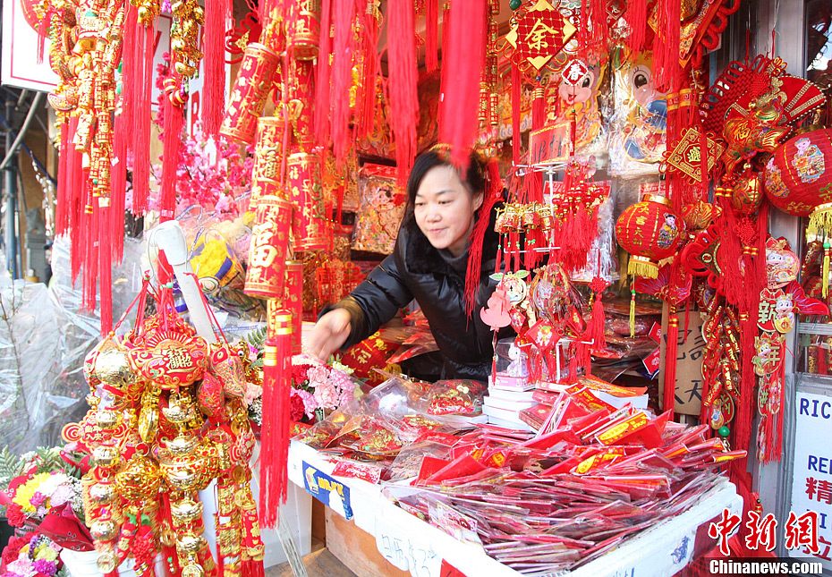 2013中国蛇年春节即将来临,纽约华人社区年味渐浓,纽约华裔忙着置办年货,一些经营年货的商埠生意兴隆。中新社发 阮煜琳 摄