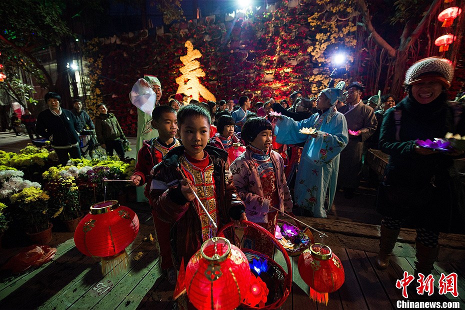 2月8日,广东佛山传统特色贺年活动“卖懒”在南风古灶上演。大人们带着小朋友手提灯笼,沿街叫喊“卖懒卖懒,卖到年三十晚,人懒我不懒”,以此教育小朋友除掉懒惰恶习,来年勤奋努力。中新社发 龙宇阳 摄