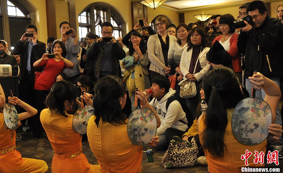 美国东部时间2月8日,印第安纳州西拉法叶,为庆祝中国蛇年春节,普渡大学孔子学院在校举办新春茶会,中国学生表演的中国舞蹈,吸引众多来宾。中新社发 孔祥嘉 摄