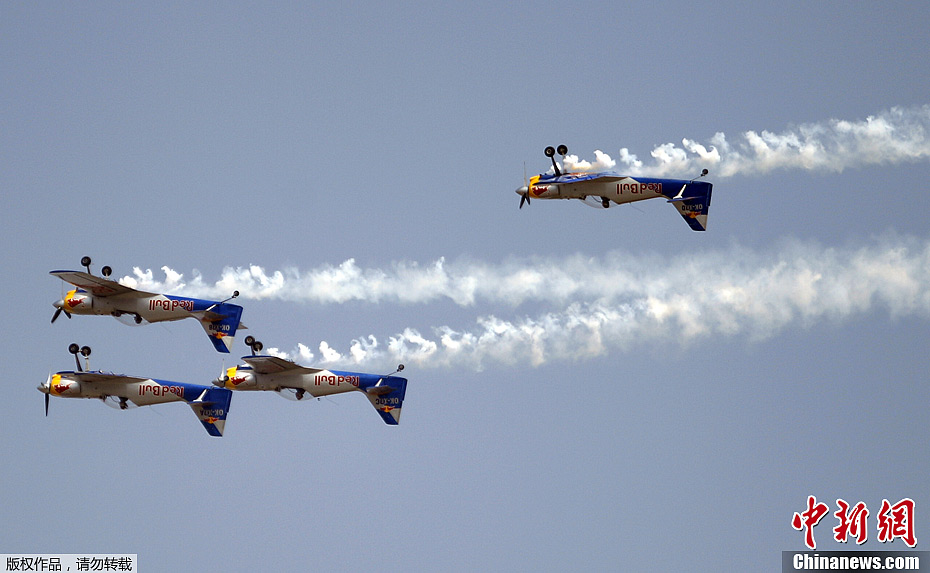当地时间2月9日,为期5天的印度第9届航展在班加罗尔Yelahanka空军基地继续进行,各飞行表演队纷纷升空表演精彩特技飞行。图为飞行表演队在进行特技飞行表演。