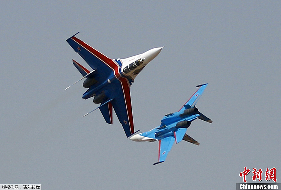 当地时间2月9日,为期5天的印度第9届航展在班加罗尔Yelahanka空军基地继续进行,各飞行表演队纷纷升空表演精彩特技飞行。图为俄罗斯“勇士”飞行表演队在进行特技飞行表演。