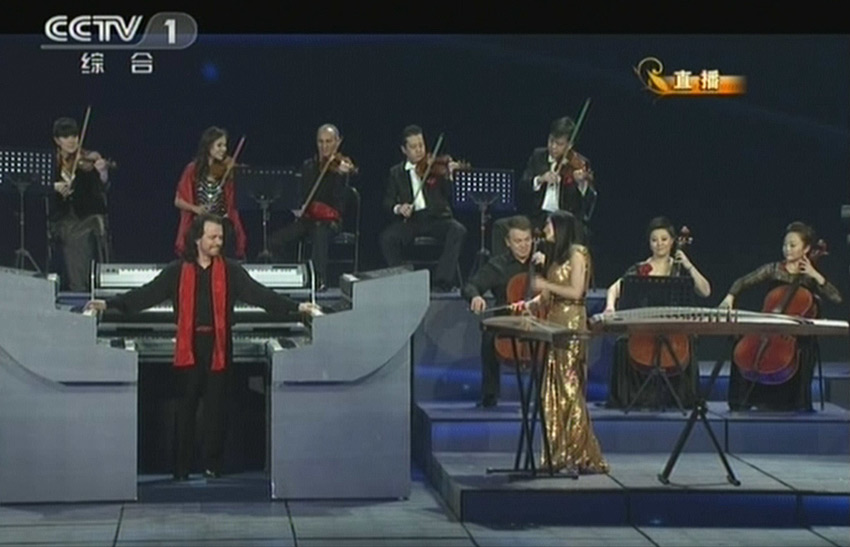 2月9日除夕夜,2013央视蛇年春节联欢晚会正式与观众见面。图为美国著名音乐家雅尼与中国音乐家共同表演创意器乐演奏《琴筝和鸣》。(电视截图)
