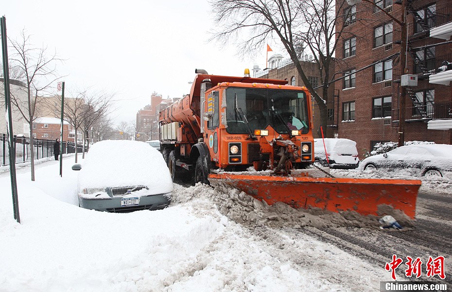 8日开始,纽约遭暴风雪袭击,航空、铁路、公路交通受到影响,部分油站出现油气短缺。已经造成1人遇难,纽约地区近4300个航班取消。部分铁路线路暂停。图为9日上午,暴风雪天气过后,纽约市政开始清理道理上的积雪。中新社发 阮煜琳 摄
