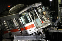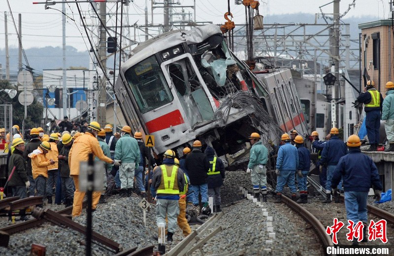 当地时间2013年2月13日,一辆火车和卡车相撞,造成16人受伤。图为日本西部兵库县火车事故现场。图片来源:东方IC