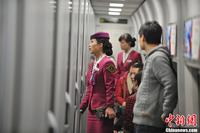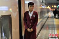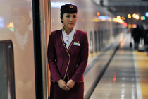 2013年全国春运,头戴粉色贝雷帽、身穿粉色上衣、脚穿黑色皮鞋、着装统一的列车乘务员,在旅客眼里,她们年轻漂亮,乐于助人,是铁路线上一道亮丽的风景线。因为她们在各自岗位上默默奉献,保障春运的畅通,换来千家万户的团聚。图为2月7日,动车D321从北京前往上海,乘务员孔昭君在车门口准备迎接旅客的到来。大可 摄 图片来源:东方IC