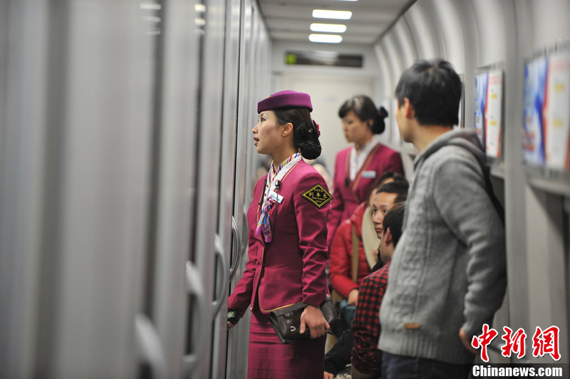 图为列车长陈丽娟需要对整列列车进行例行巡查,为旅客解决问题。图片来源:东方IC