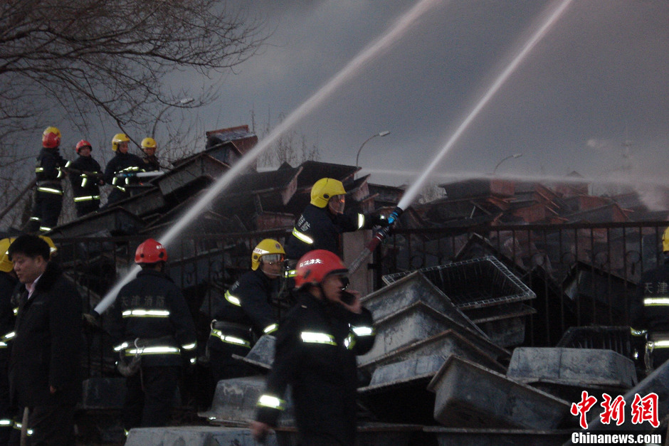 2月15日下午17点左右,位于天津市西青开发区的一家企业发生火灾,大火燃烧所产生的浓烟蔓延至市区。记者在现场看到,数十辆消防车参与灭火,大火于当晚21点左右基本扑灭。截至记者发稿时,起火原因和财产损失不明。图为火灾现场消防员们用高压水枪灭火。中新社发 佟郁 摄