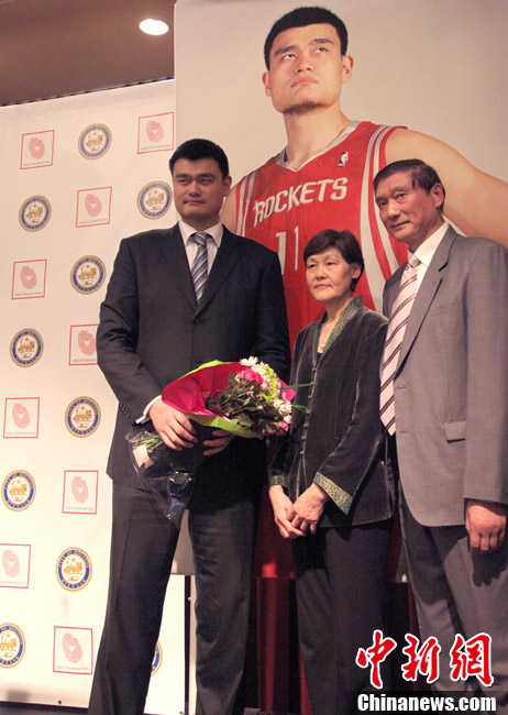 当地时间2月15日,“移动的中国长城”姚明成为美国第四大城市休斯敦的亲善大使。图为姚明和父母在自己的大幅照片前合影。中新社发 王欢 摄