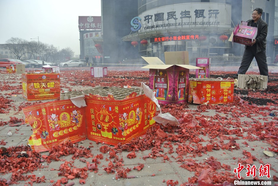 2月16日,山西太原一商家在门前燃放炮竹,烟雾冲天。当日是中国2013年农历春节长假后上班第一天,中国各地不少单位和企业按照传统习俗,在大门口外燃放鞭炮讨好彩头,祈愿新年开门大吉、生意兴隆。中新社发 韦亮 摄