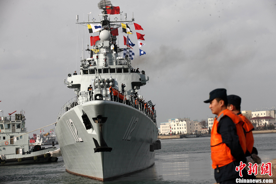 2月16日上午10时,中国海军第十四批护航编队从青岛某军港起航,奔赴亚丁湾、索马里海域接替第十三批护航编队执行护航任务。这是海军北海舰队第二次派出水面舰艇兵力组织执行护航任务。中国海军第十四批护航编队由导弹驱逐舰哈尔滨舰、导弹护卫舰绵阳舰和综合补给舰微山湖舰组成,编队含2架舰载直升机、数十名特战队员,共730余人。中新社发 徐崇德 摄
