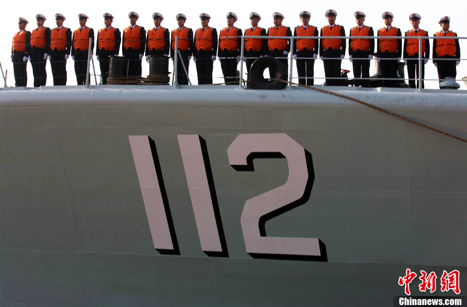 2月16日上午10时,中国海军第十四批护航编队从青岛某军港起航,奔赴亚丁湾、索马里海域接替第十三批护航编队执行护航任务。这是海军北海舰队第二次派出水面舰艇兵力组织执行护航任务。中国海军第十四批护航编队由导弹驱逐舰哈尔滨舰、导弹护卫舰绵阳舰和综合补给舰微山湖舰组成,编队含2架舰载直升机、数十名特战队员,共730余人。中新社发 徐崇德 摄
