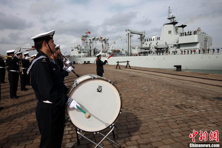 2月16日上午10时,中国海军第十四批护航编队从青岛某军港起航,奔赴亚丁湾、索马里海域接替第十三批护航编队执行护航任务。这是海军北海舰队第二次派出水面舰艇兵力组织执行护航任务。中国海军第十四批护航编队由导弹驱逐舰哈尔滨舰、导弹护卫舰绵阳舰和综合补给舰微山湖舰组成,编队含2架舰载直升机、数十名特战队员,共730余人。中新社发 徐崇德 摄