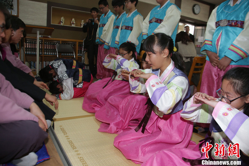 韩国小学毕业典礼 老师为学生洗脚