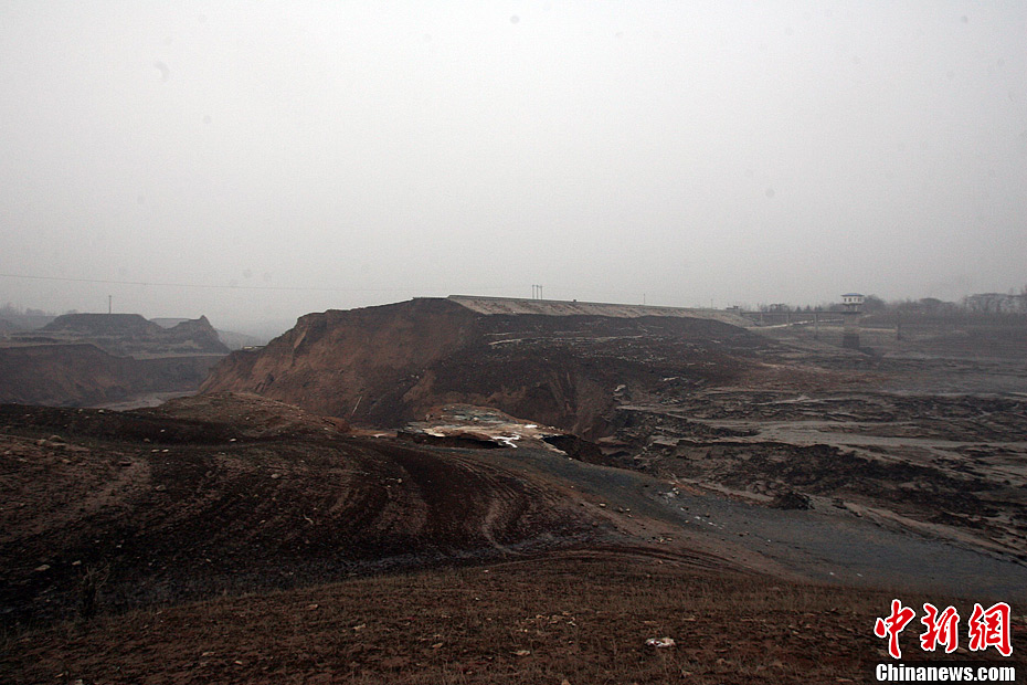 2月15日山西省洪洞县曲亭水库灌溉输水洞洞顶垮塌,导致下游坝体出现管涌,满蓄1900万立方米的水库几近干涸,坝体塌陷长度近300米。截至记者发稿时止,临汾市委、市政府成立抢险指挥部,下设现场抢险组、综合协调组、交通保障组、安全保卫组、电力保障组和医疗保障组。目前,暂无人员伤亡报告。图为2月16日,已经干涸的水库。张云 摄