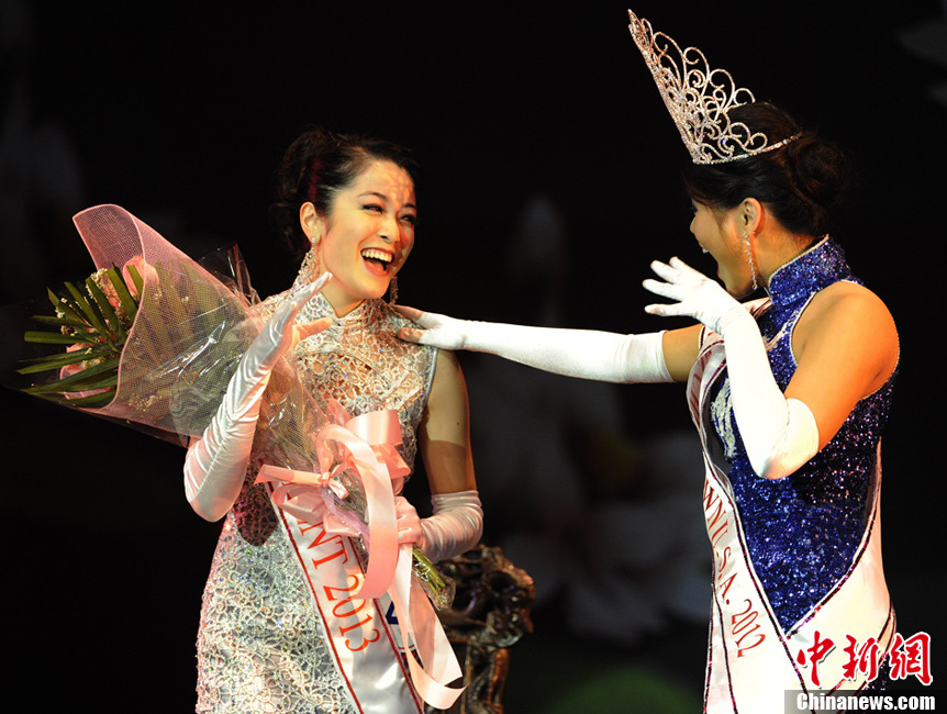 当地时间2月16日晚,美国旧金山艺术宫,20岁的纽约大学传媒和播音系学生李卓尔(左)荣获2013年度全美华埠小姐冠军。12名佳丽参与角逐旧金山中华总商会主办的历史最悠久的选美赛事。中新社发 陈钢 摄