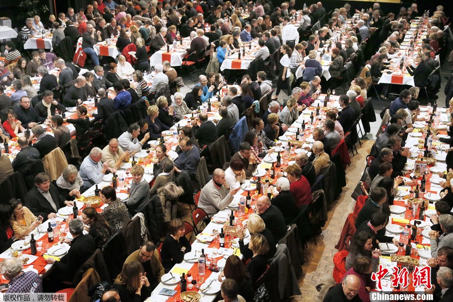 当地时间2013年2月17日,法国Sarlat-la-Caneda,农业节上,700人同时聚餐享“全鹅宴”。