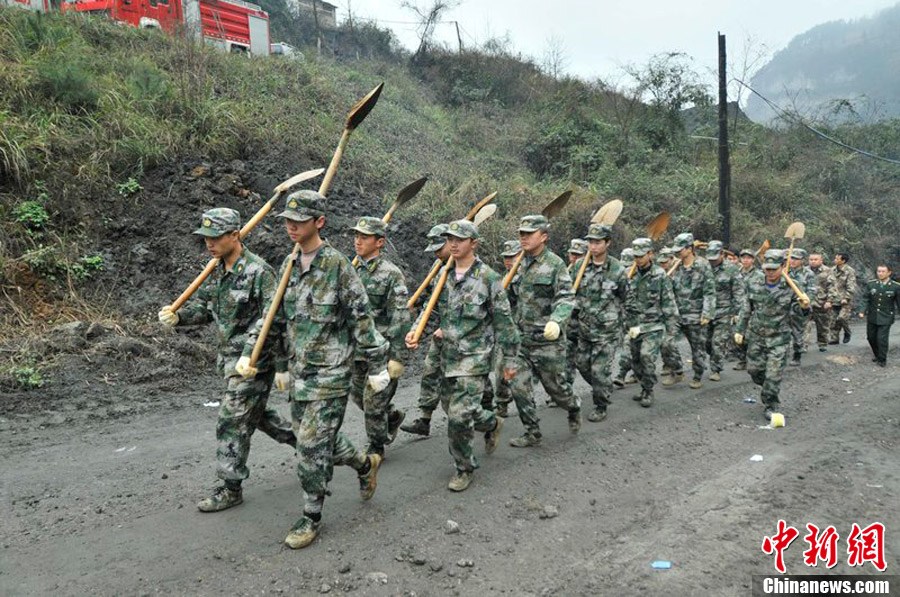 2月18日,贵州凯里发生山体滑坡。图为武装部民兵到达事故现场前去施救。陈沛亮 摄 图片来源:CFP视觉中国