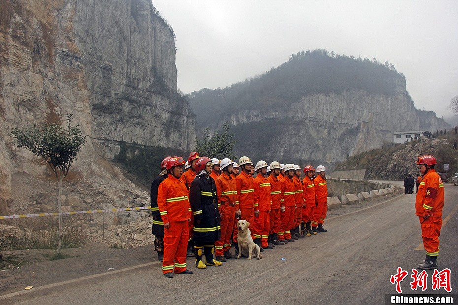 2月18日11时30分许,贵州省凯里市龙场镇鱼洞村平地煤矿处岔河百余米高的山体发生崩塌,掩埋了春节期间放假值守的工棚,初步核实有5人在此次崩塌中失踪。事故地点位于凯里市龙场镇鱼洞村下院组两岔河口处凯施公路旁的平地煤矿处,据进一步核查,这起山体滑坡滑坡高约100米,宽约30米,滑坡量约5400立方米。截至18日14时35分,事故地点山体仍然在发生零星崩塌,具体被掩埋人数有待进一步核实。图为救援现场。中新社发 吴青玲 摄