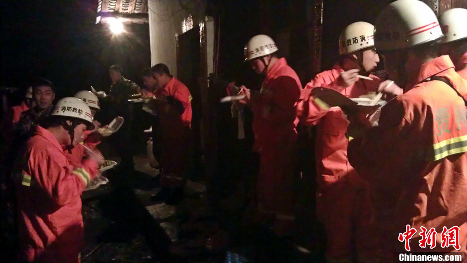 截止2月18日19时45分,事故地点山体还在发生大量崩塌,根据现场勘察专家的建议,目前还不具备救援条件,现场自然灾害点周边21户79人以及救援指挥部正在按照专家的建议转移至安全地带。图为换班的救援队员正在吃晚餐。中新社发 李桐 摄